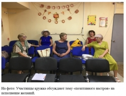 ИНФОРМАЦИОННАЯ СПРАВКА от 5 сентября 2024 года О работе дискуссионного кружка «Нематериальные практики» Дата: 5 сентября 2024 года Наименование мероприятия: Занятие дискуссионного кружка «Нематериальные практики», тема «Разговаривай с собой… и у тебя появится всё, что пожелаешь» (техника «позитивного настроя» на исполнение мечты)»; Категория: социокультурное просвещение, досуговое; Целевое назначение: 1. Удовлетворение культурных и социальных потребностей получателей услуг. 2. Реализация программ «Активное долголетие» и «Национальный Проект Демография». Задача занятия: 1. Обсуждение проблемы «неисполнения желаний». 2. Пути решения проблемы, практики «позитивного настроя» на исполнение мечты. 3. Реализация программы «Активное долголетие» Организаторы: 1 специалист по социальной работе ОМО Участники: члены клуба «60 лет – не возраст!» - 5 участников, 1 специалист. Описание: Участники занятия, предварительно, просмотрели фильмы для погружения в тему: «Думай позитивно… и желания исполнятся». Выяснили - чтобы получить то, чего очень сильно хочется, само собой одного желания недостаточно. Нужно планировать, действовать, трудиться. Но для всего этого нужно вдохновение, определенный позитивный настрой. Чем смелее и решительнее получается действовать, тем быстрее исполняется желание. Хорошо работают визуализации, нужно в красках представлять - как получается желаемое. Необходимо выяснить: точно ли это ваша мечта, а не то, что навязано родственниками, социумом, образом жизни (техника +/- на листе бумаги). Хорошо работают оформленные намерения — можно сделать «карту желаний» или совершить какое-то одно действие в сторону мечты. Медитации, аффирмации, а также творчество тоже будут хорошо помогать в реализации ваших мечтаний. Например, если вы хотите похудеть, то чаще представляйте себя стройной и красивой, не забывайте о пищевых ограничениях и физических упражнениях. Отлично работает «фиксация целей», «списки желаний», а лучше всего ведение «дневника», где будут прописаны и сами желания и то, какие мысли и чувства они вызывают, что человек делает для того, чтобы их осуществить. Очень важно поменьше рассказывать окружающим о своих задумках — это распыляет внимание. Результат: Участники занятия выразили большой интерес к теме. Сложная тема понравилась, все выразили желание научиться техникам «позитивного настроя» на исполнение желаний.